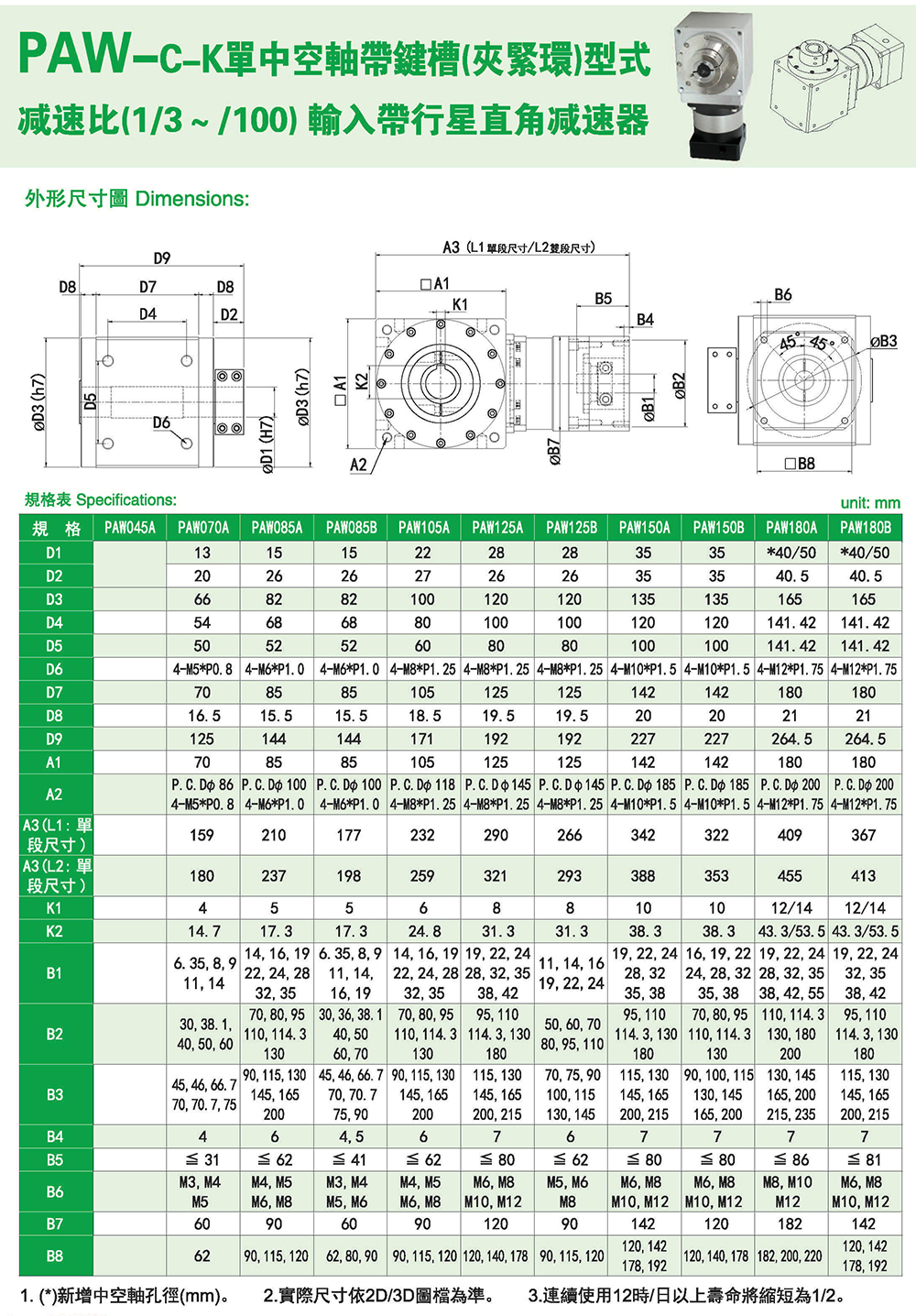 PAW-C-K单中空轴带键槽(夹紧环)型式 输入带行星直角减速器