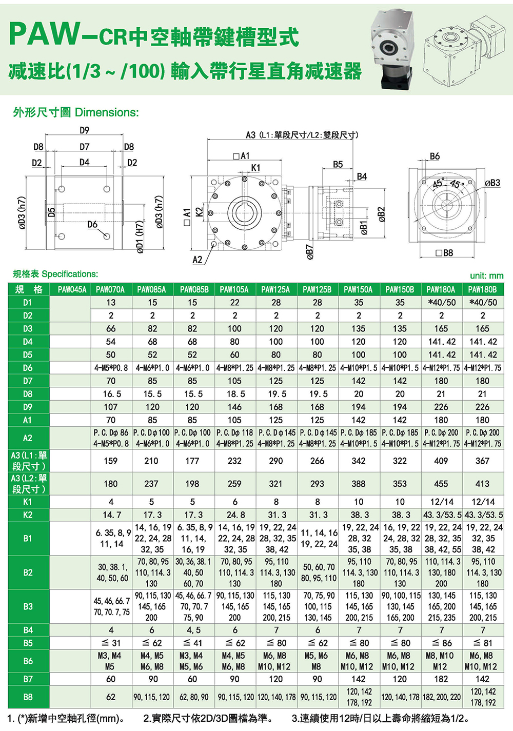 PAW-CR中空轴带键槽型式 输入带行星直角减速器