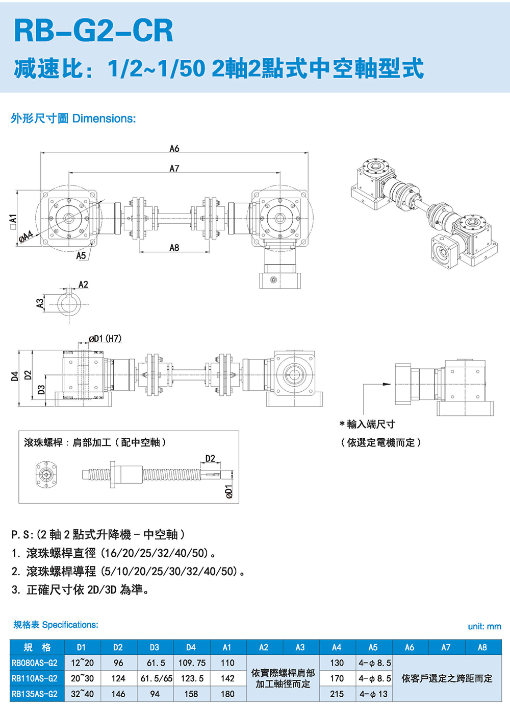 多样化:输出轴种类多样化,有单出力轴型、双出力轴型、中空轴型、中空法兰型、中空轴锥形紧迫性、螺杆直线型、螺牙直线型。