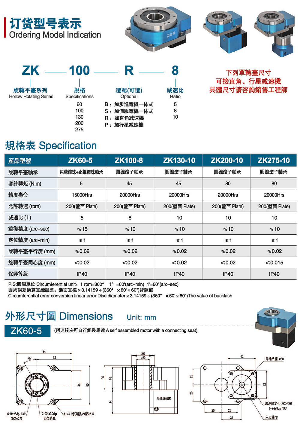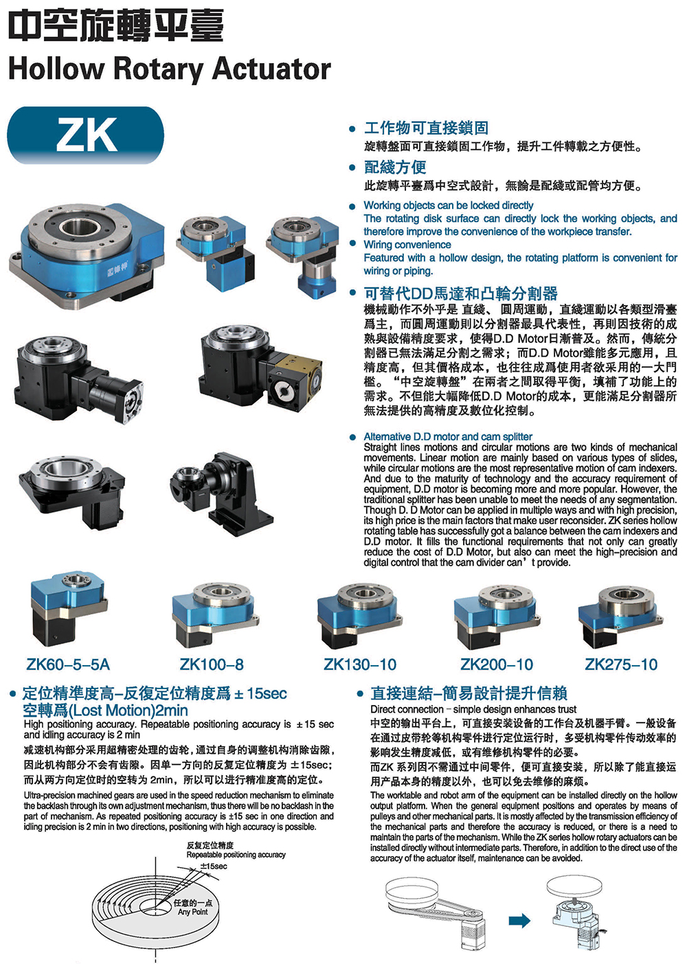 中空的输出平台上,可直接安装设备的工作台及机器手臂。一般设备在通过皮带轮等机构零件进行定位运行时,多受机构零件传动效率的影响发生精度减低,或有维修机构零件的必要。而zK系列因不需通过中间零件,便可直接安装,所以除了能直接运用产品本身的精度以外,也可以免去维修的麻烦。