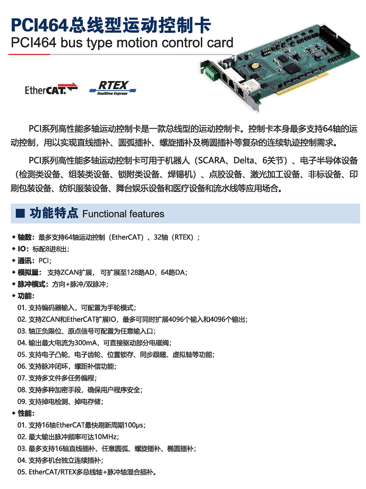 PCI系列高性能多轴运动控制卡是一款总线型的运动控制卡。 控制卡本身支持64轴的运动控制,用以实现直线插补、圆弧插补、螺旋插补及椭圆插补等复杂的连续轨迹控制需求。