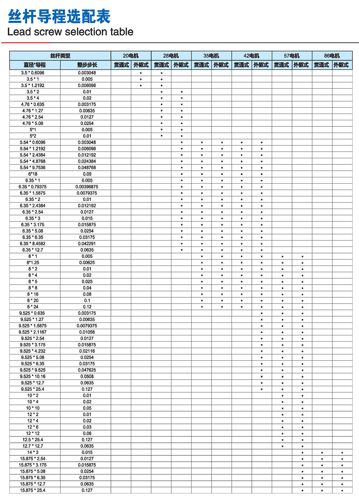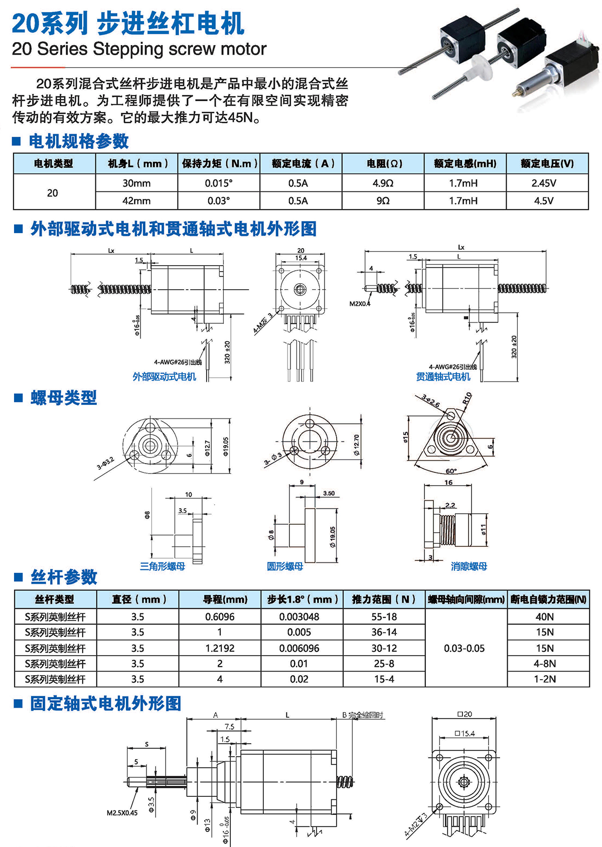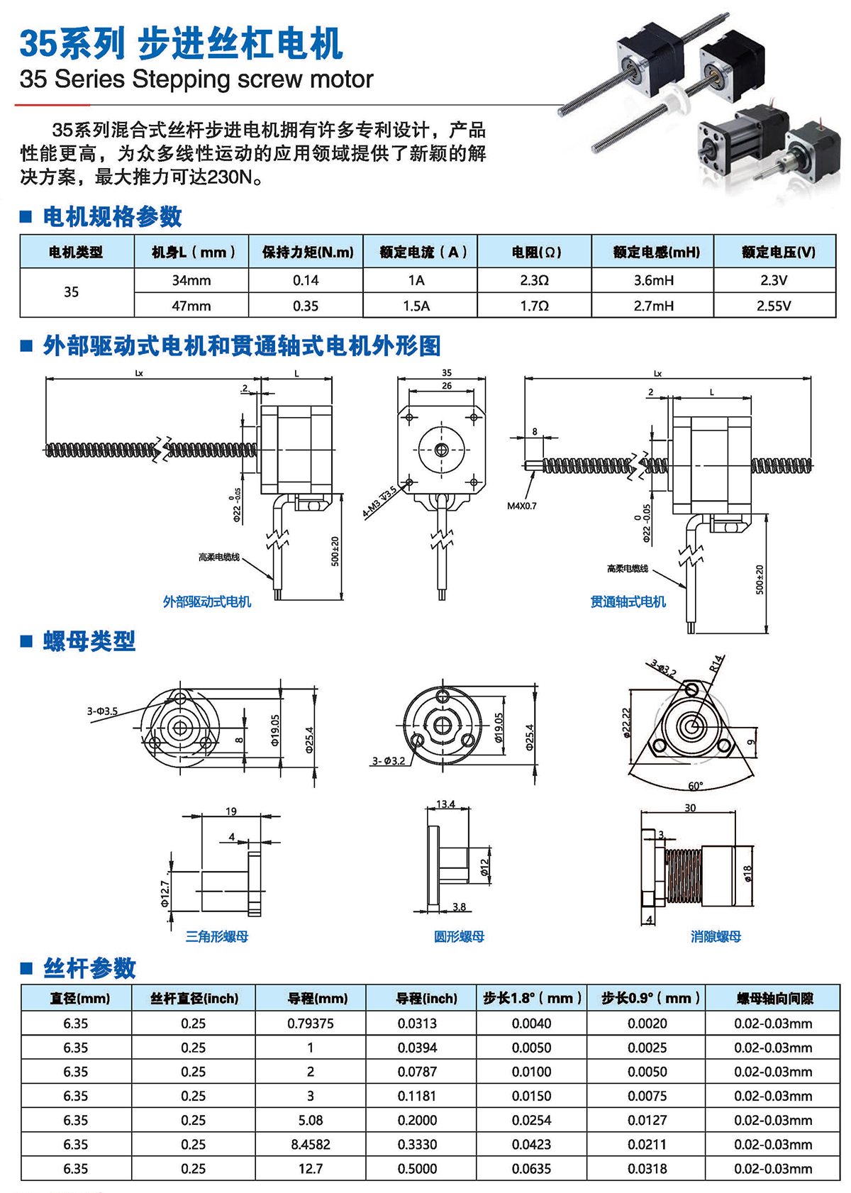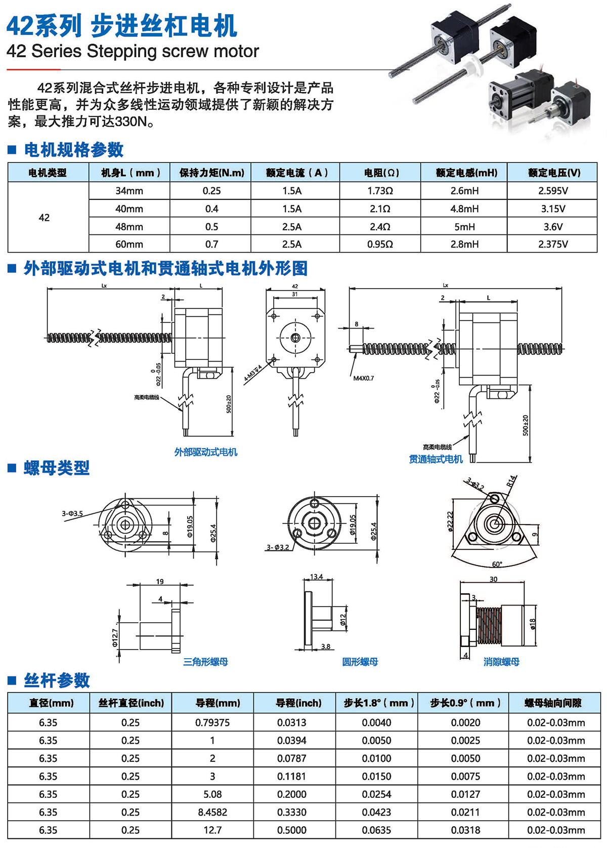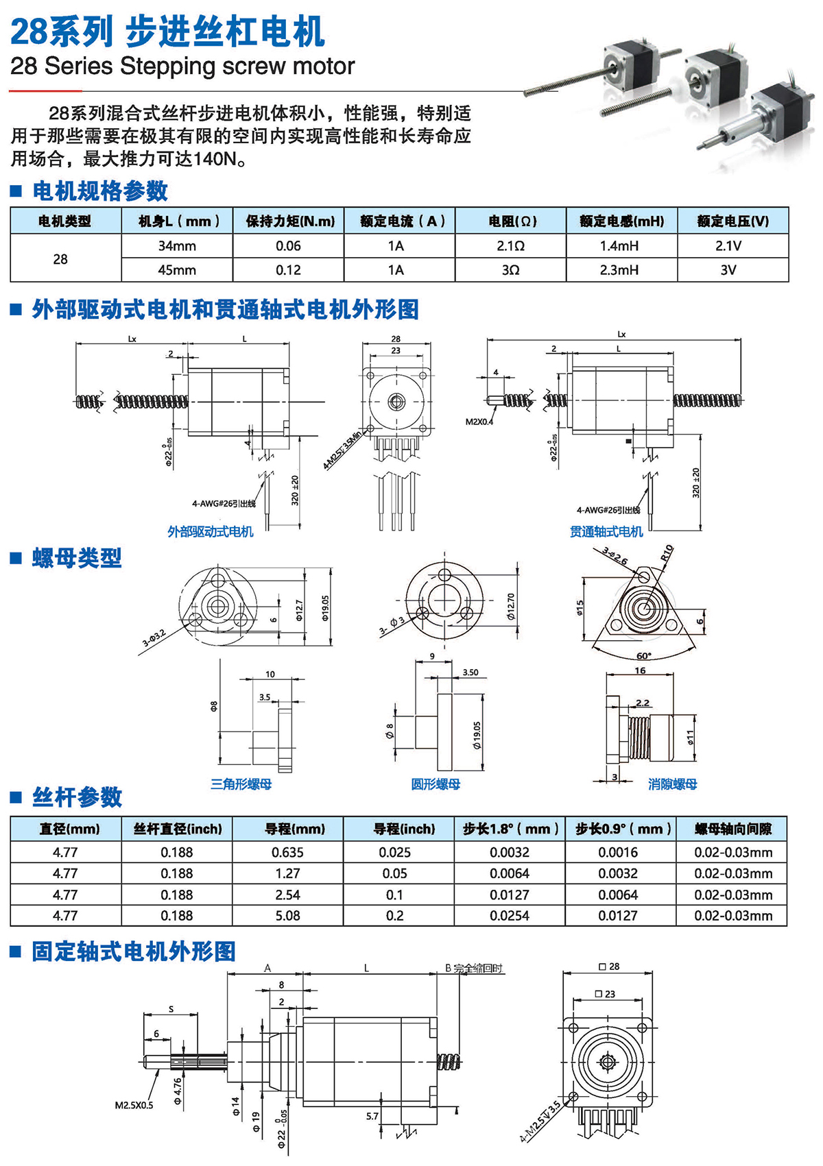 丝杆步进电机系列产品提供了简单有效的直线运动方案,简化了从旋转运动到 直线运动的转化过程,它将运动的转换过程在电机本体完成,不再需要皮带、齿轮 齿条、联轴器和其他机械部件来实现旋转运动到直线运动的转换,大大节省了零部 件的采购成本和系统组装时间,有效解决了因多次转接造成的精度损失,提高 了结 构空间的利用率和定位精度。我司的产品结构简单、紧凑,适用于500mm行程内运 行,步进分辨率小为0.0015mm,推力可达200多公斤力。