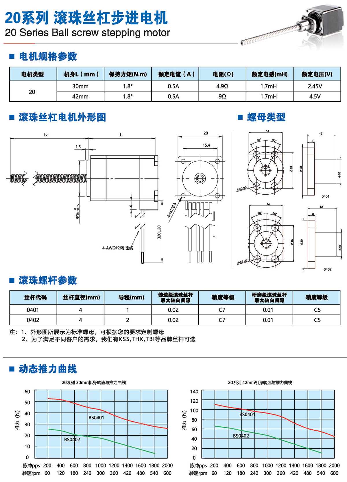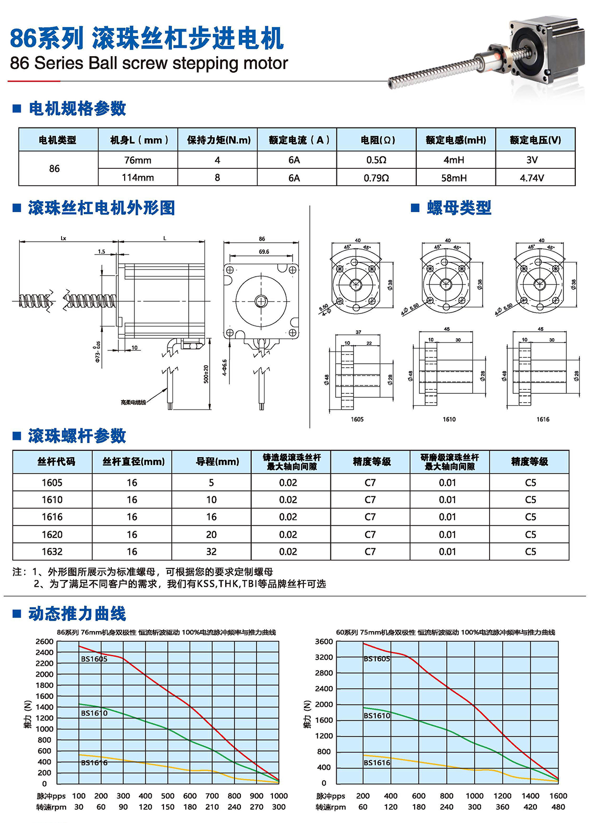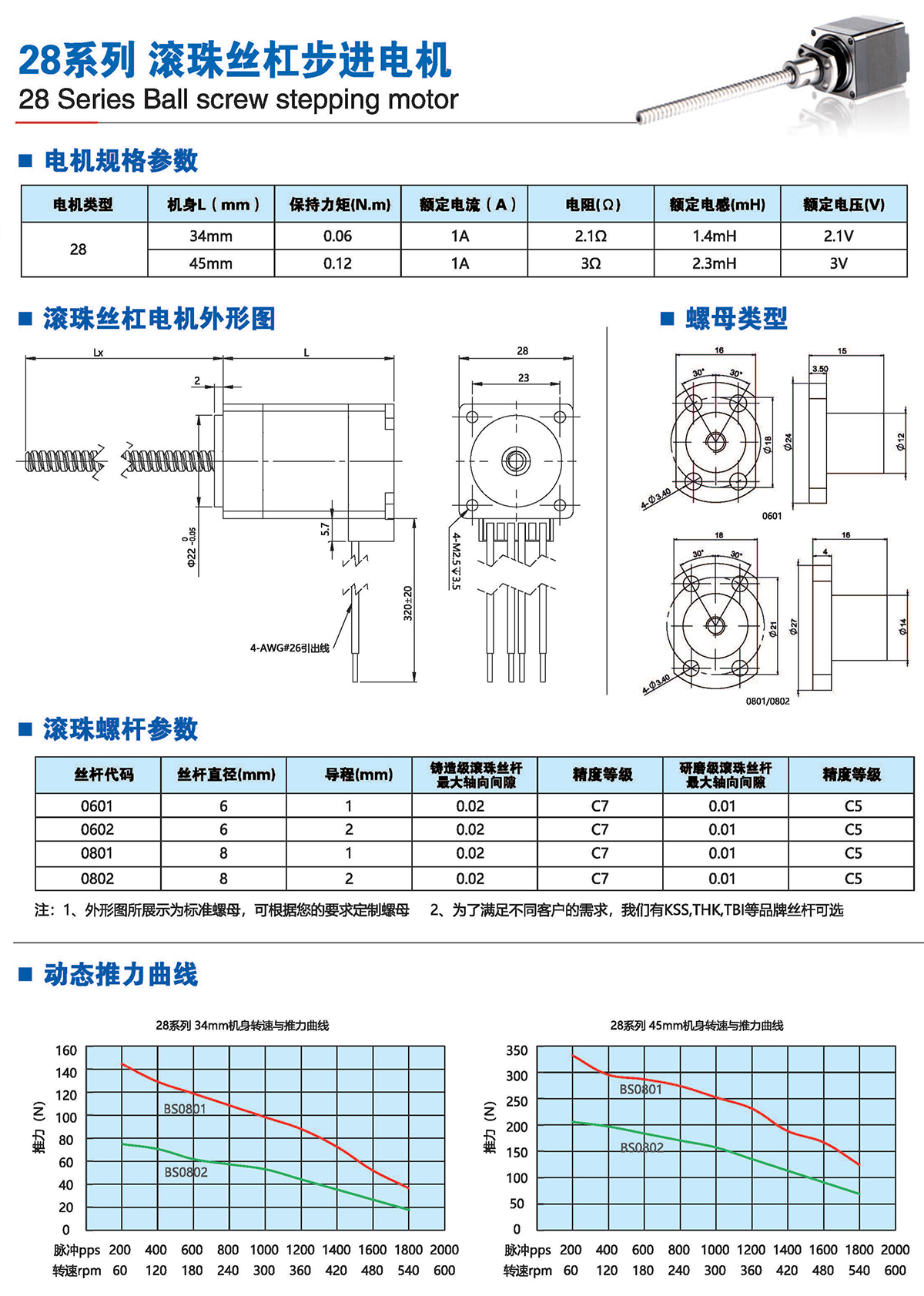 滚珠丝杆步进电机有六种尺寸,外形尺寸从14mm至86mm,滚珠丝杆电机为外部驱动式。 从0.005mm/步到0.1mm/步,有多种步长可选。最大推力可达1600N,全系可选配编码器。