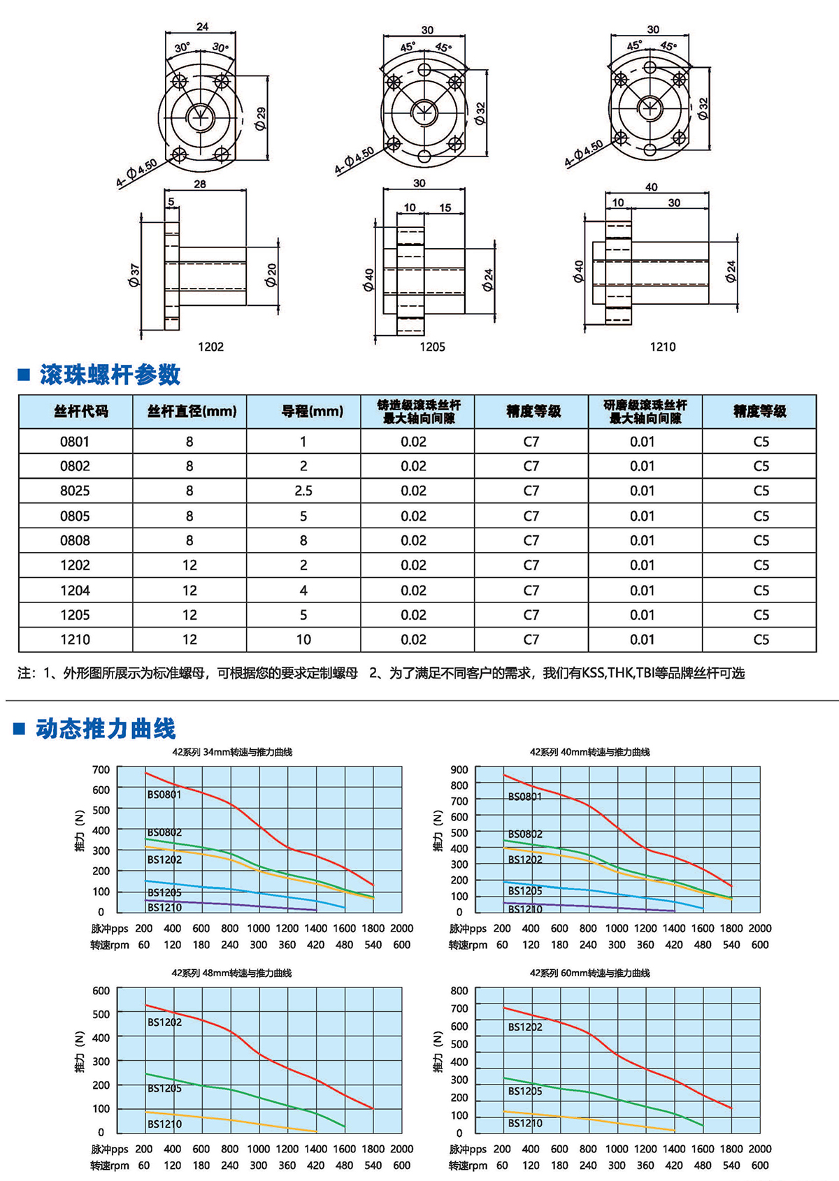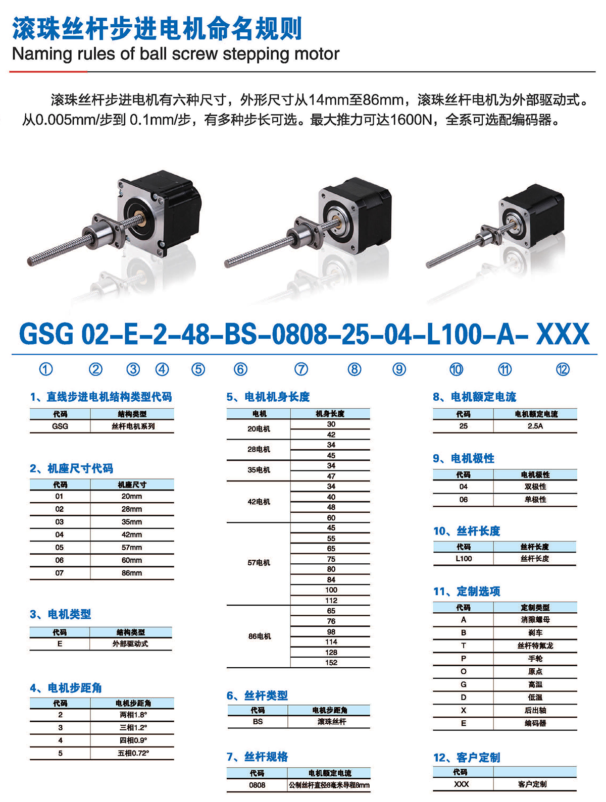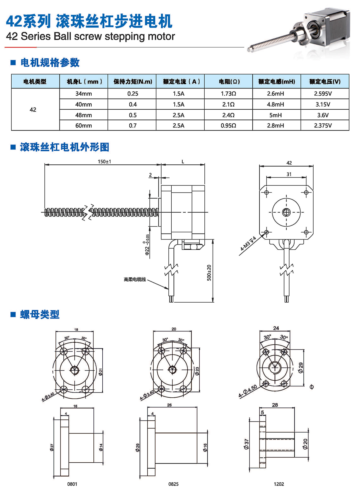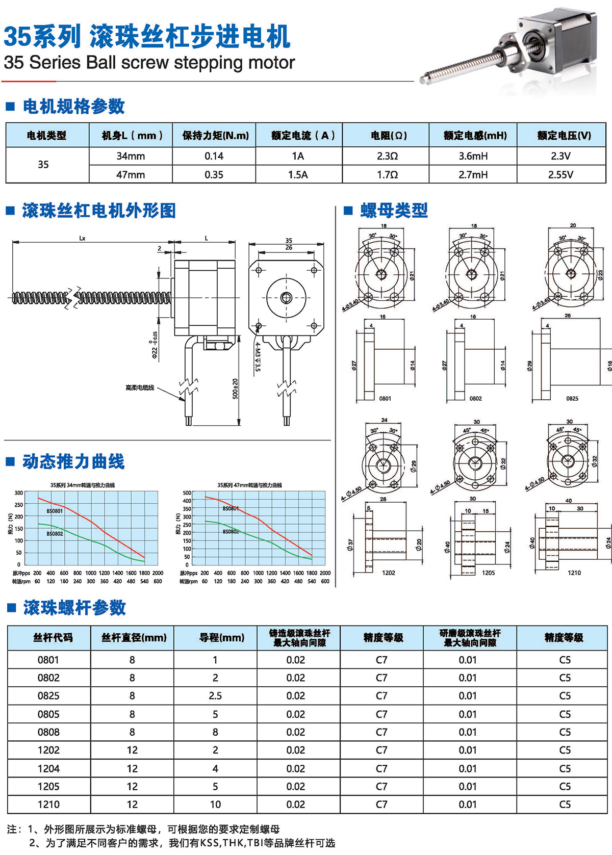 滚珠丝杆步进电机有六种尺寸,外形尺寸从14mm至86mm,滚珠丝杆电机为外部驱动式。 从0.005mm/步到0.1mm/步,有多种步长可选。最大推力可达1600N,全系可选配编码器。