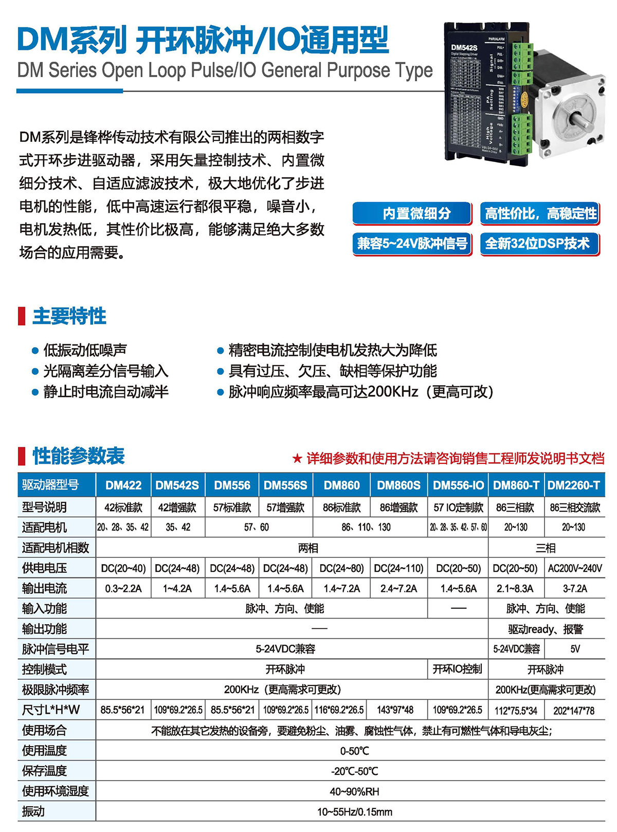 DM系列是锋桦传动技术有限公司推出的两相数字式开环步进驱动器,采用矢量控制技术、内置微细分技术、自适应滤波技术,极大地优化了步进电机的性能,低中高速运行都很平稳,噪音小,电机发热低, 其性价比极高,能够满足绝大多数场合的应用需要。