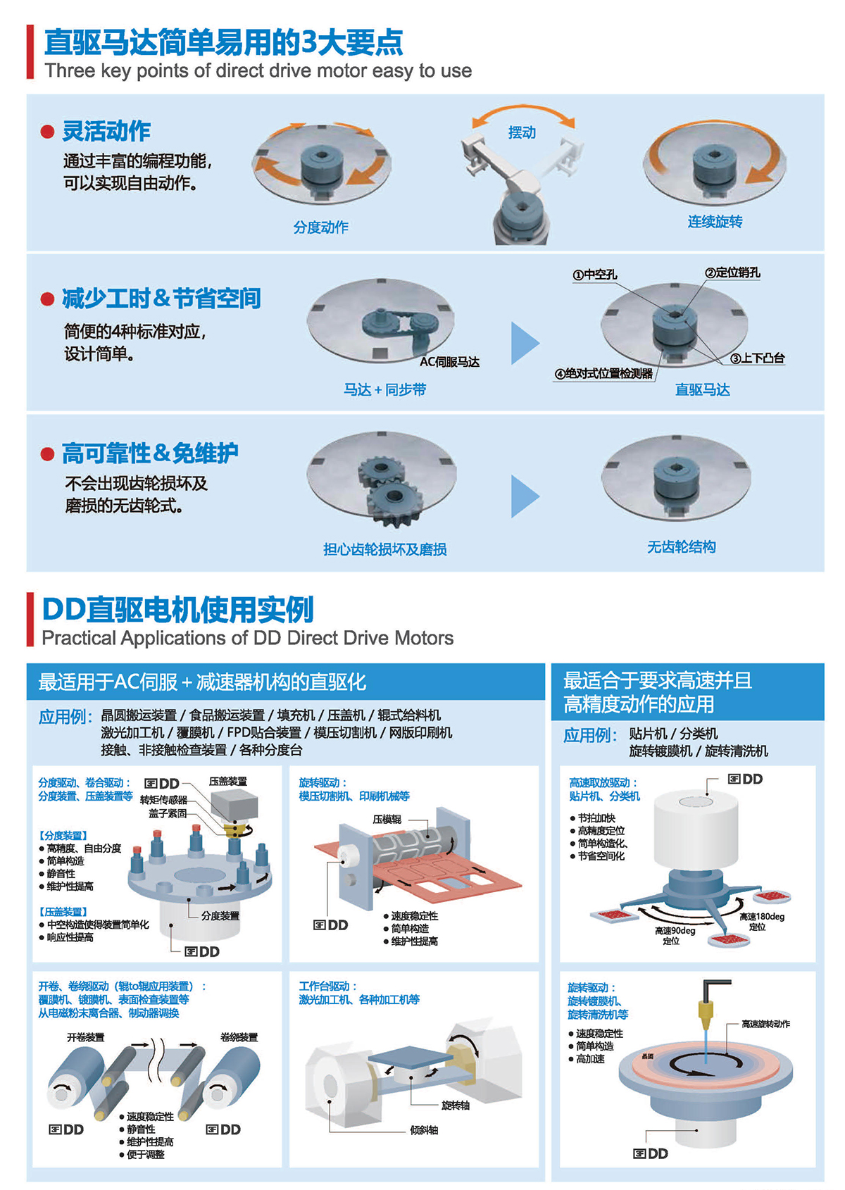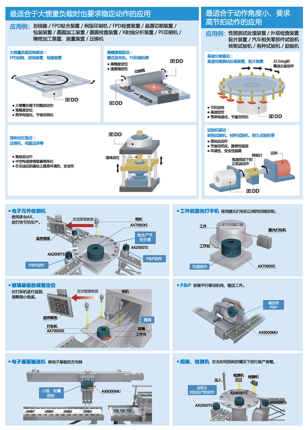 直径从60mm-490mm、连续扭矩从1-1200N.m有十几个大小可选规格,绝对精度可达±10arc-sec,重复定位精度可达±0.5arc-sec。具有高精度、高刚性、低轴向径向跳动等优点,被广泛应用于半导体生产设备、光媒体、光学对位、定位检测、精密数控机床、汽车装配/检测、液晶制造设备、屏幕贴合设备、锂电池制造设备、高端丝印设备及医疗器械等微精密高端制造业领域。