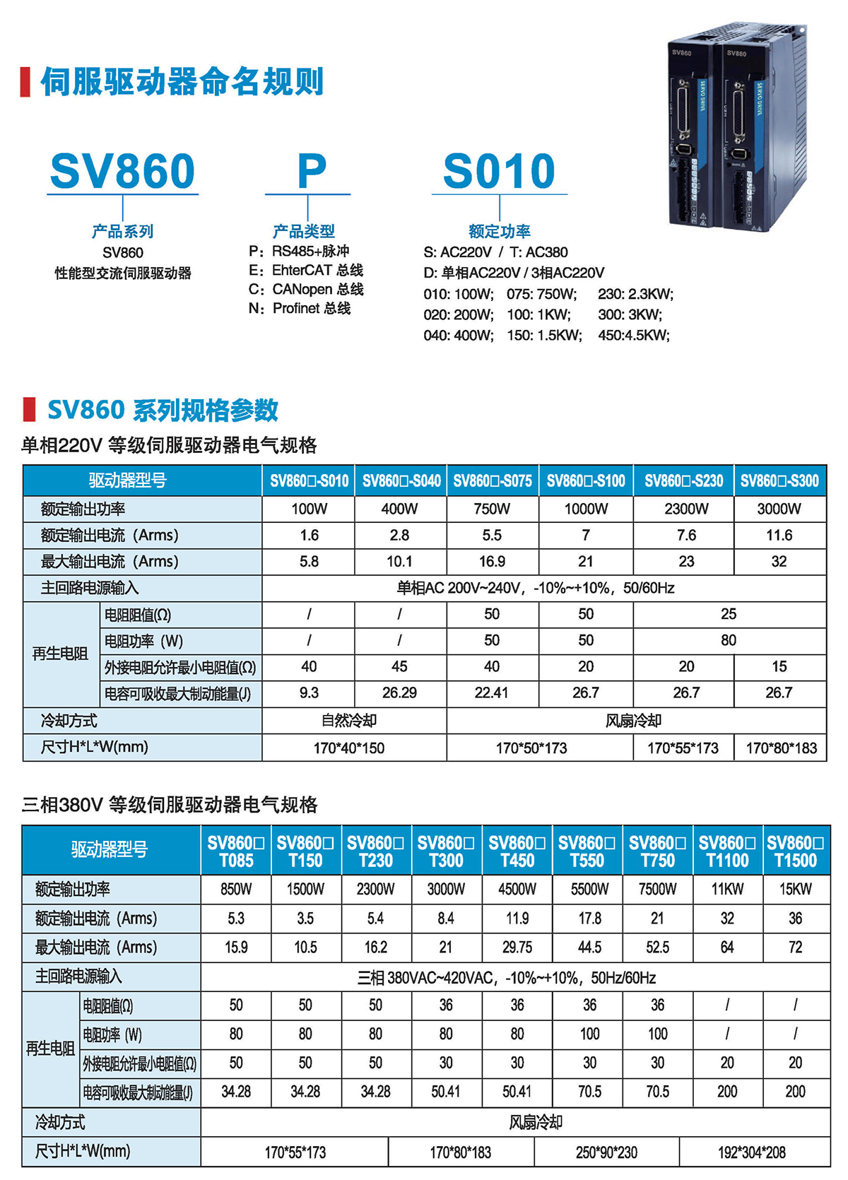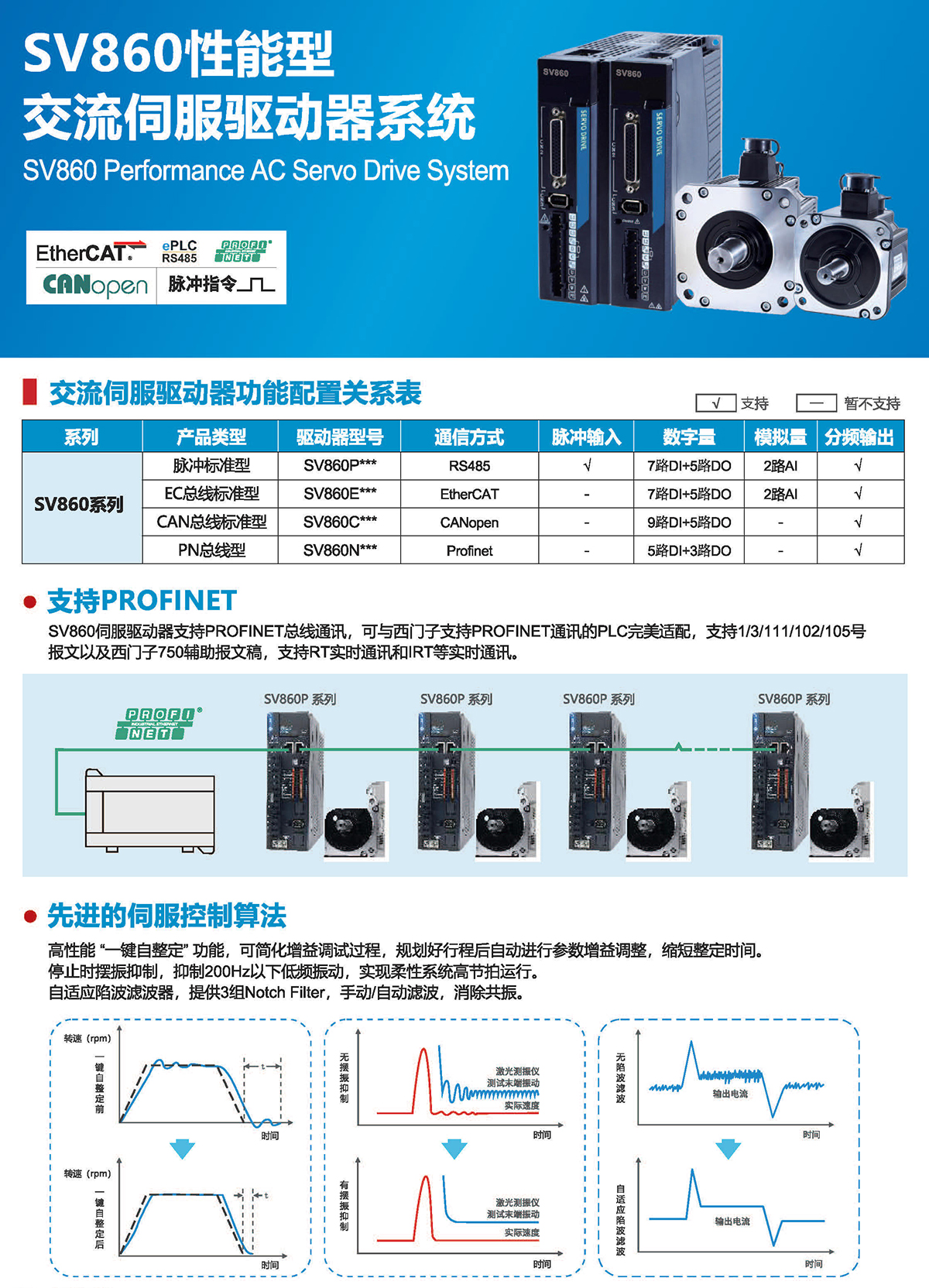 SV860伺服驱动器支持PROFINET总线通讯,可与西门子支持PROFINET通讯的PLC完美适配,支持13/111/102/105号报文以及西门子750辅助报文稿,支持RT实时通讯和IRT等实时通讯。