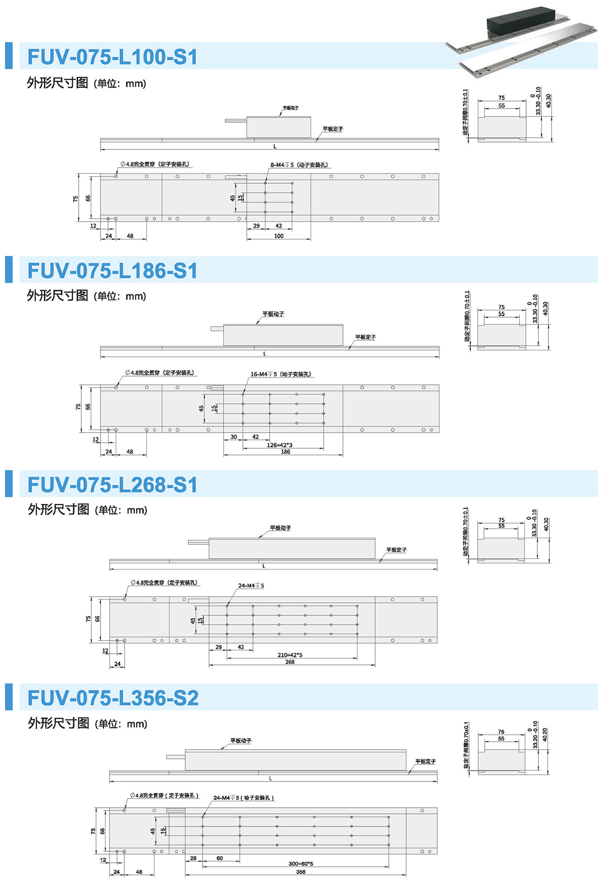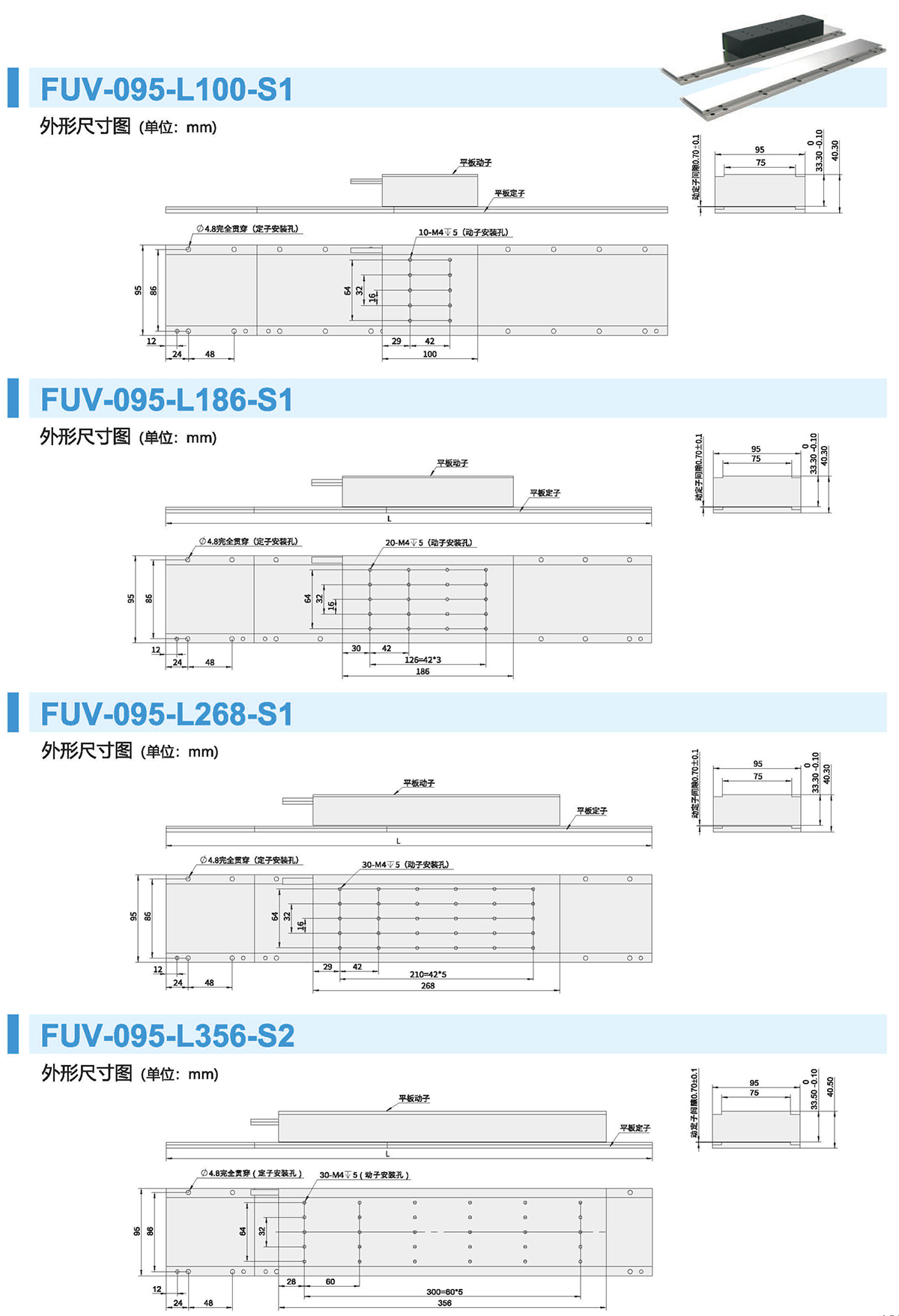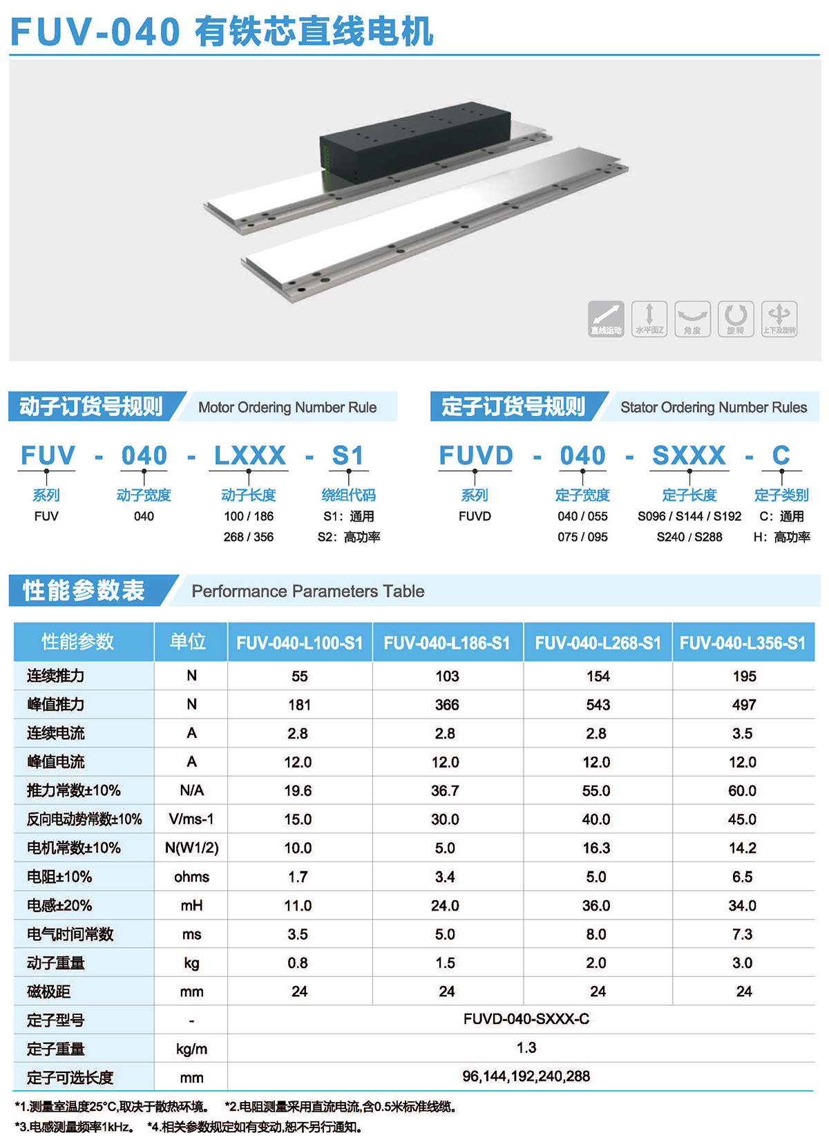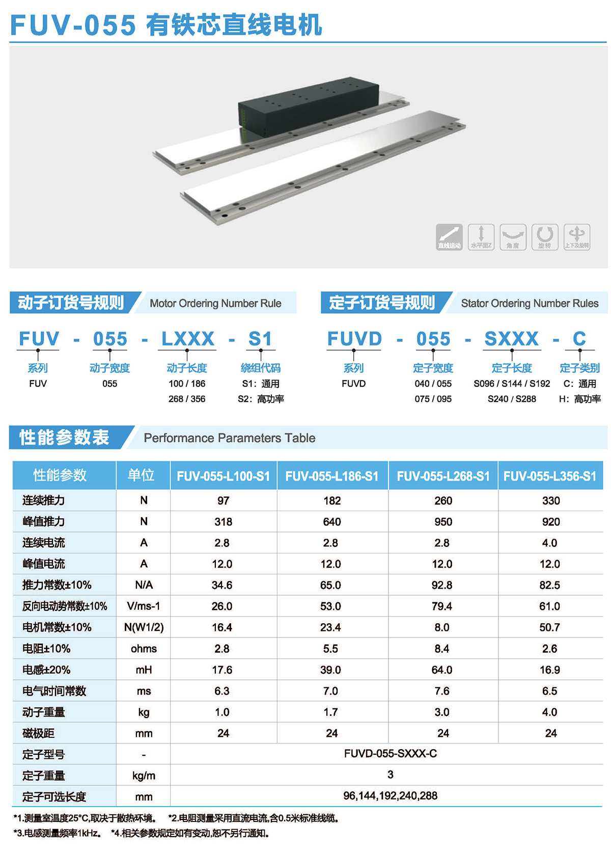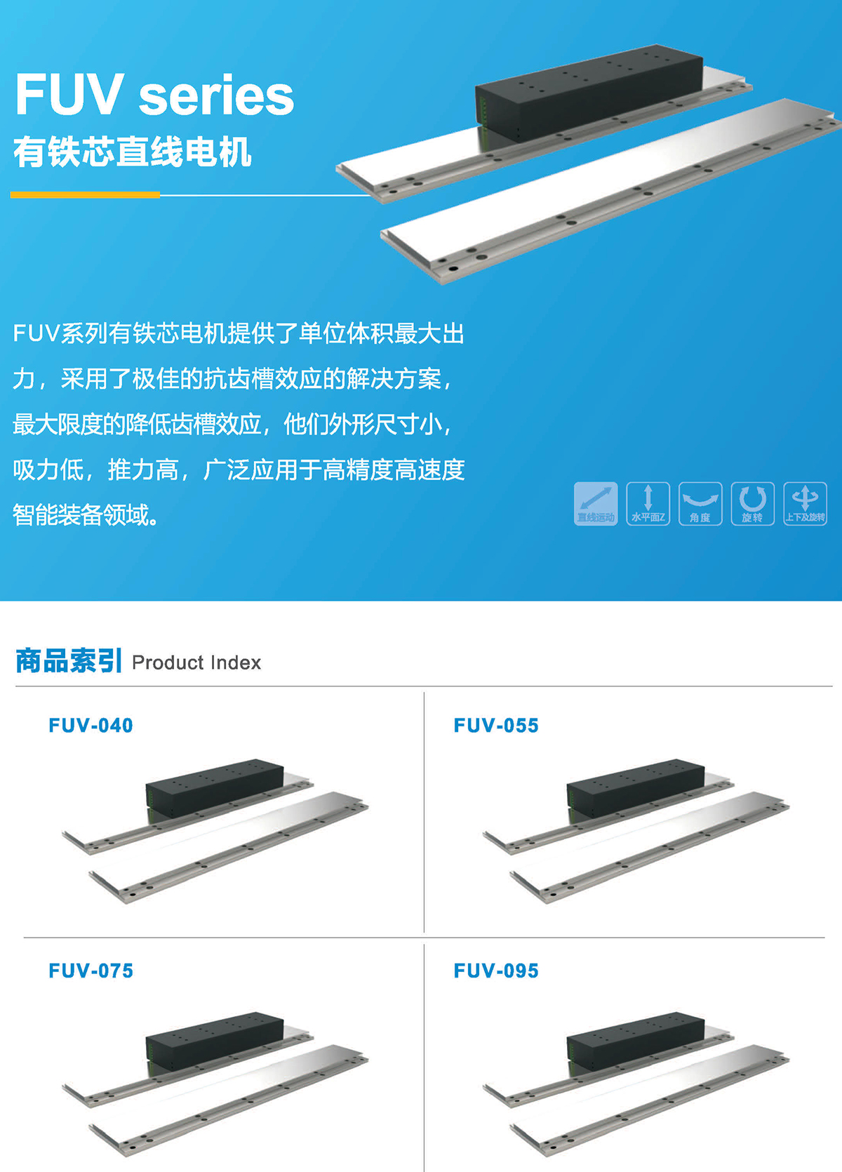 FUV系列有铁芯电机提供了单位体积最大出力,采用了极佳的抗齿槽效应的解决方案,最大限度的降低齿槽效应,他们外形尺寸小,吸力低,推力高,广泛应用于高精度高速度智能装备领域。