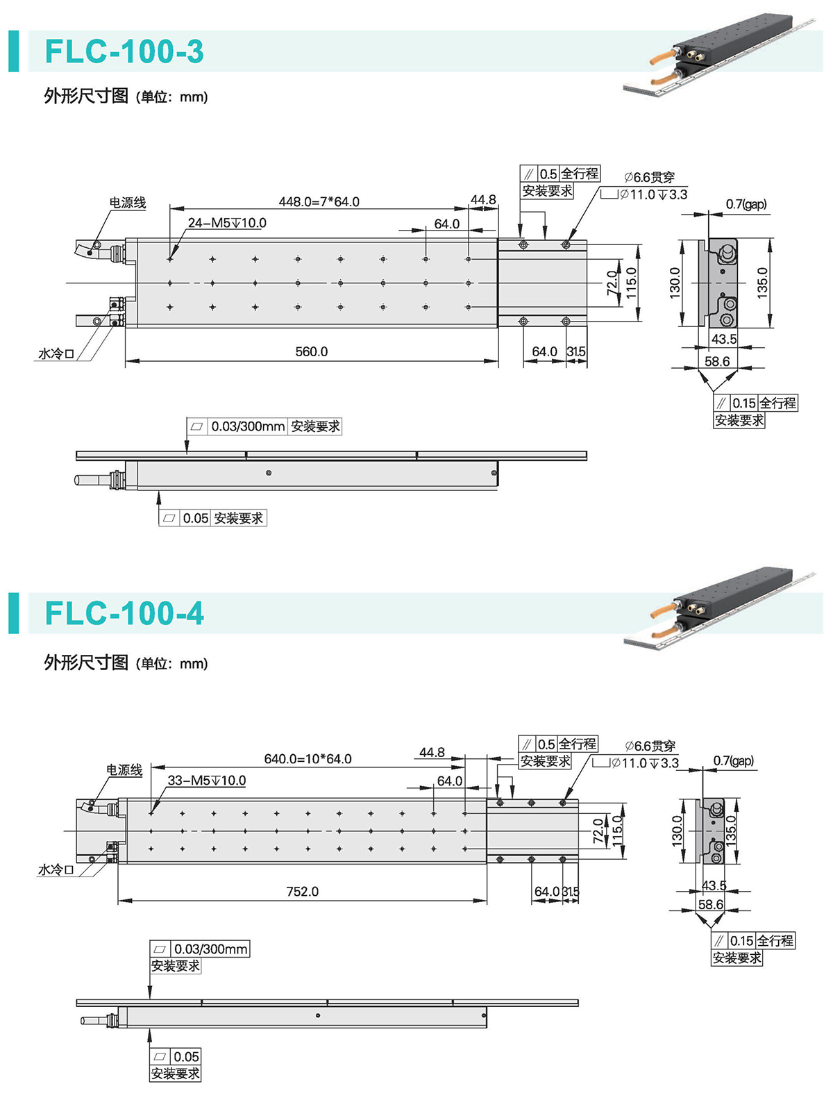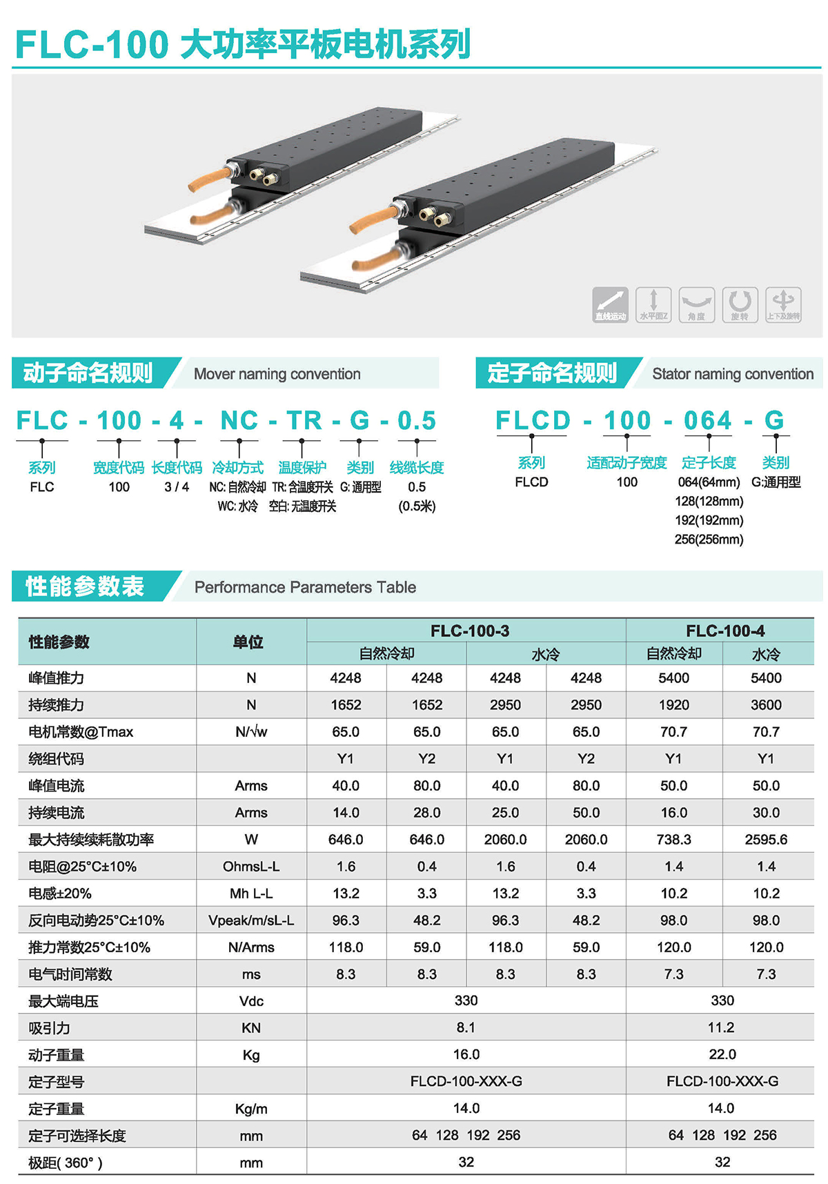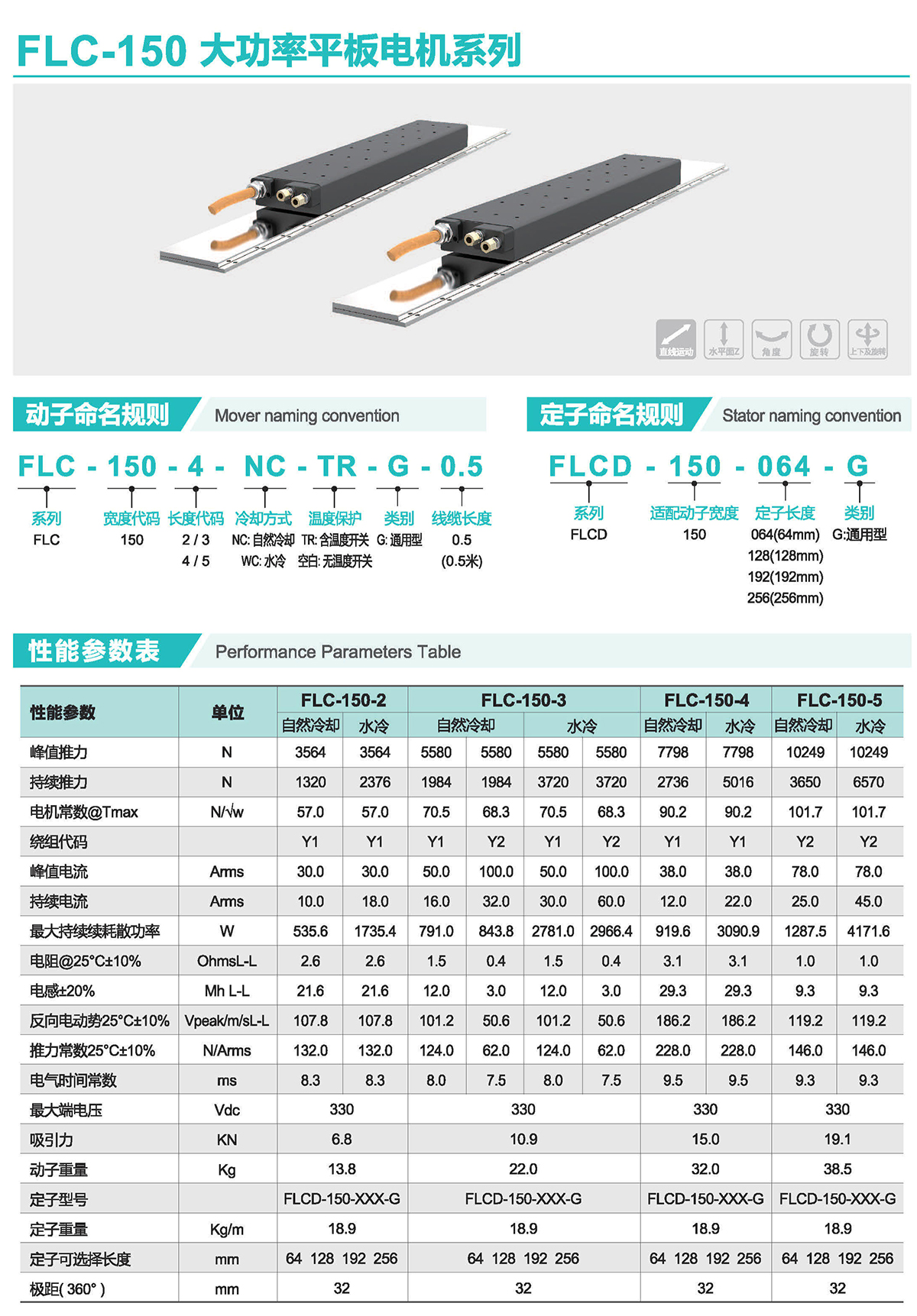 FLC有铁芯电机内置高效水冷系统,能有效抑制温升。它们采用先进的齿槽效应抑制技术,最大限度降低齿槽效应。