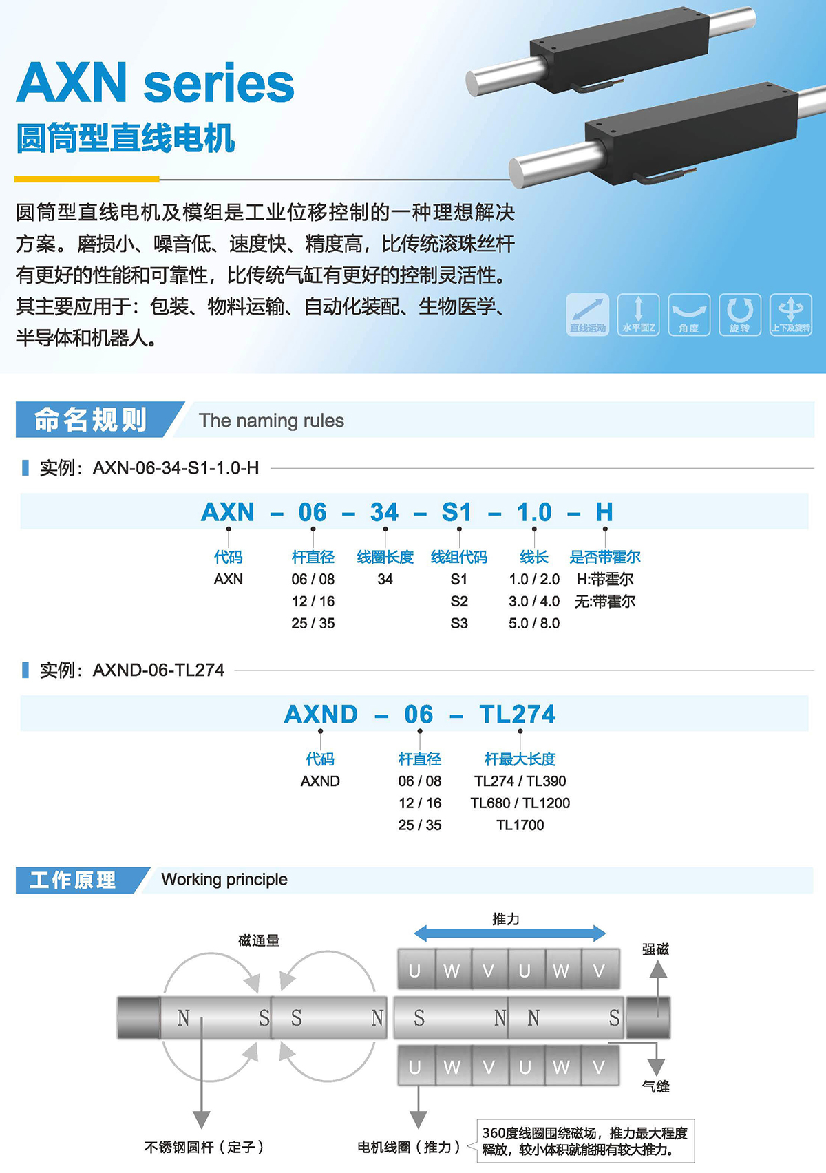圆筒型直线电机及模组是工业位移控制的一种理想解决方案。磨损小、噪音低、速度快、精度高,比传统滚珠丝杆有更好的性能和可靠性,比传统气缸有更好的控制灵活性。
